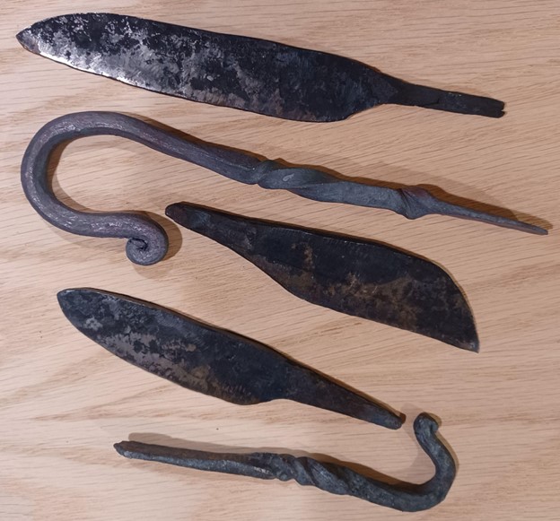 Description: In the morning we will be getting used to working with wrought iron by drawing out some bar stock and making a hook. In the afternoon forge welding high carbon steel to a bar of iron and then drawing out a tang and the blade to make a small forge welded knife. Time permitting burn in a handle and heat treat the knife.